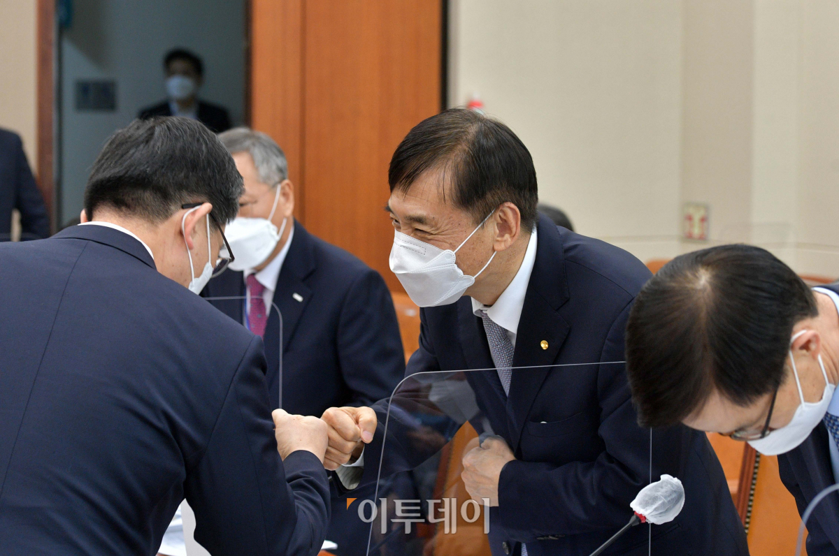 이주열 한국은행 총재가 23일 국회에서 열린 기획재정위원회의 전체회의에 출석, 회의 시작에 앞서 의원들과 인사를 나누고 있다.