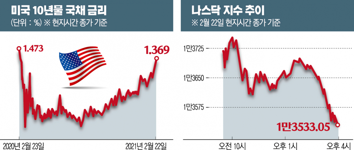 23일 코스피지수는 전일 대비 00% 하락한 00에 장을 마감했다. 미국 국채 금리 상승이 전 세계 증시에 영향을 끼치는 모양새다. 미 10년물 국채 금리는 지난 16일 처음으로 1.3%를 돌파한 후 전날 1.369%까지 상승했다.