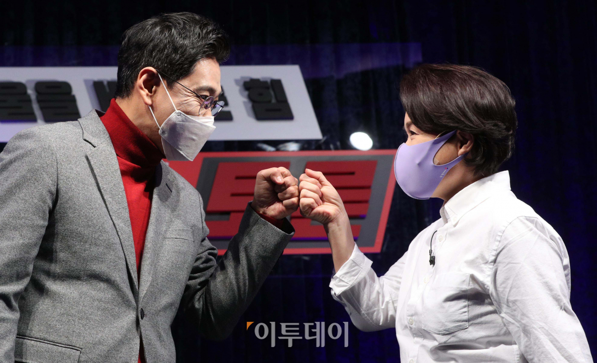 23일 서울 용산구 백범김구기념관 대회의실에서 국민의힘 서울시장 예비후보 3차 맞수토론이 열린 가운데 맞수토론 상대인 오신환, 조은희 후보가 주먹인사를 하고 있다. 국회사진취재단