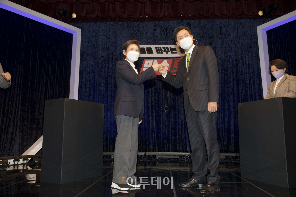 23일 서울 용산구 백범김구기념관 대회의실에서 국민의힘 서울시장 예비후보 3차 맞수토론이 열린 가운데 나경원 후보와 오세훈 후보가 포즈를 취하고 있다. 국회사진취재단