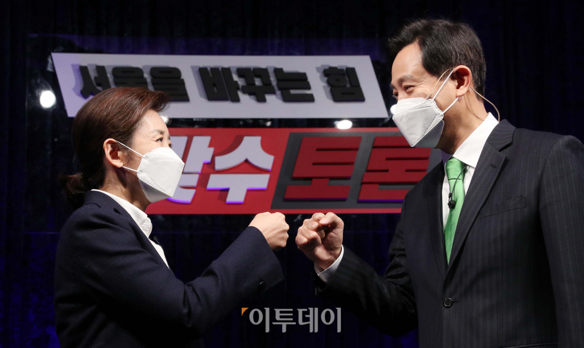 23일 서울 용산구 백범김구기념관 대회의실에서 국민의힘 서울시장 예비후보 3차 맞수토론이 열린 가운데 맞수토론 상대인 나경원, 오세훈 후보가 주먹인사를 하고 있다. 국회사진취재단
