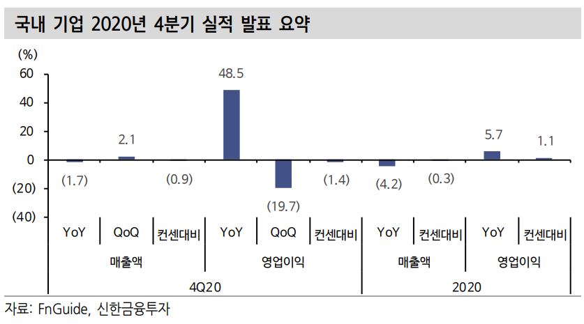 신한금융투자는 24일 "2020년 4분기 국내 기업들의 매출액과 영업이익은 각각 전년동기대비 -1.7%, 48.5%의 증가했다"며 "영업이익이 2019년대비 큰 폭으로 증가한 것은 2019년 4분기 기저효과가 크지만 컨센서스 대비 하회한 정도가 낮아 긍정적인 부분이 존재한다"고 분석했다.