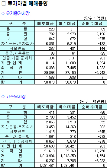 코스닥시장에서는 기관이 2억6000만원 소폭 순매도를 보였다. 자산운용(9억), 보험(6억5000만원), 증권(6억6000만원)이 순매수를 보였고, 연기금(9억7000만원), 저축은행(7억7000만원), 사모펀드(6억4500만원), 은행(8000만원)등은 순매도했다.