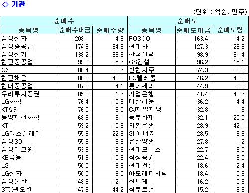 기관은 코스피에서 삼성전자, 삼성중공업, 삼성전기, 한진중공업, GS, 한진해운등을 가장 많이 사들였고, POSCO, 현대차, 한국전력, GS건설, 신한지주, LG텔레콤등을 가장 많이 팔아치웠다.