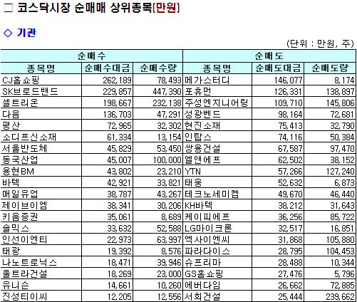 코스닥에선 기관 순매수상위종목으로 CJ홈쇼핑, SK브로드밴드, 셀트리온, 다음, 평산, 소디프신소재등이 올랐고, 메가스터디, 포휴먼, 주성엔지니어링, 성광벤드, 현진소재, 인탑스등은 순매도상위종목을 차지했다.