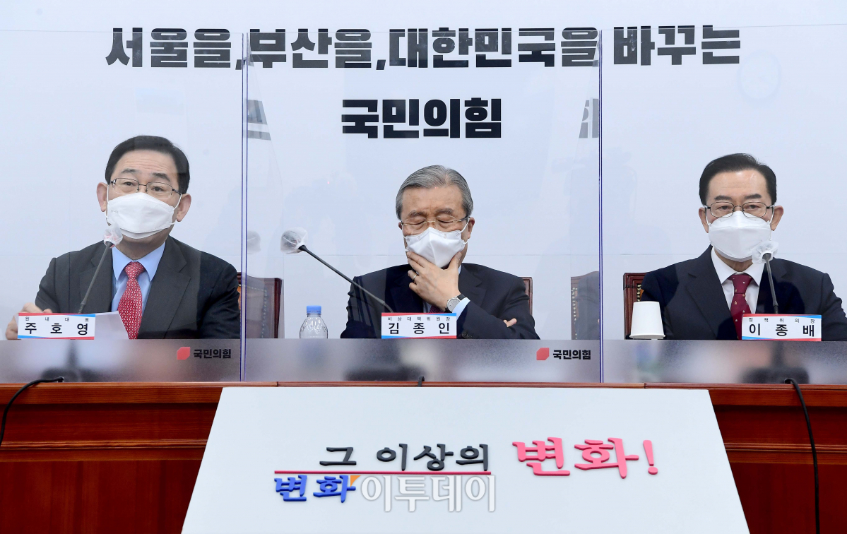 김종인 국민의힘 비상대책위원장이 2일 서울 여의도 국회에서 열린 국민의힘 비상대책위원회의에서 눈을 감고 잠시 생각에 잠겨 있다.
