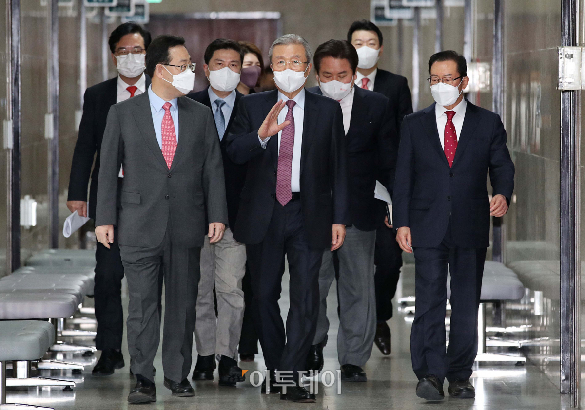 국민의힘 김종인 비상대책위원장과 주호영 원내대표가 2일 오전 서울 여의도 국회에서 열린 비상대책위원회의에 참석하며 대화를 하고 있다.