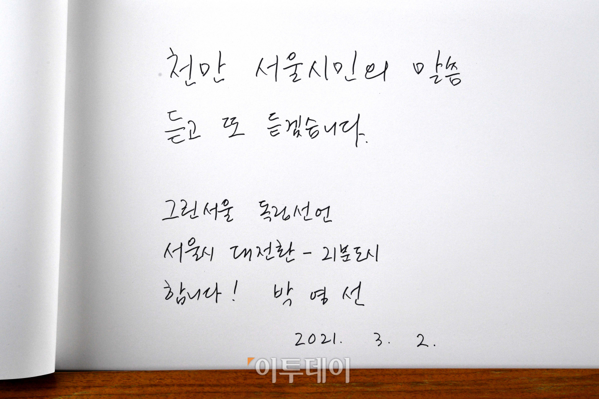 박영선 더불어민주당 서울시장 후보가 2일 오전 서울 동작구 국립서울현충원에서 현충탑 참배를 마친 후 작성한 방명록의 사진. 국회사진취재단