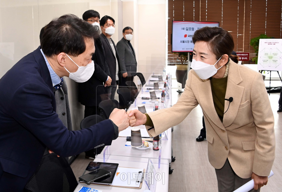 나경원 국민의힘 서울시장 예비후보가 2일 서울 금천구 가산디지털단지를 방문해 중소·IT 기업 대표들과 인사를 하고 있다. 국회사진취재단