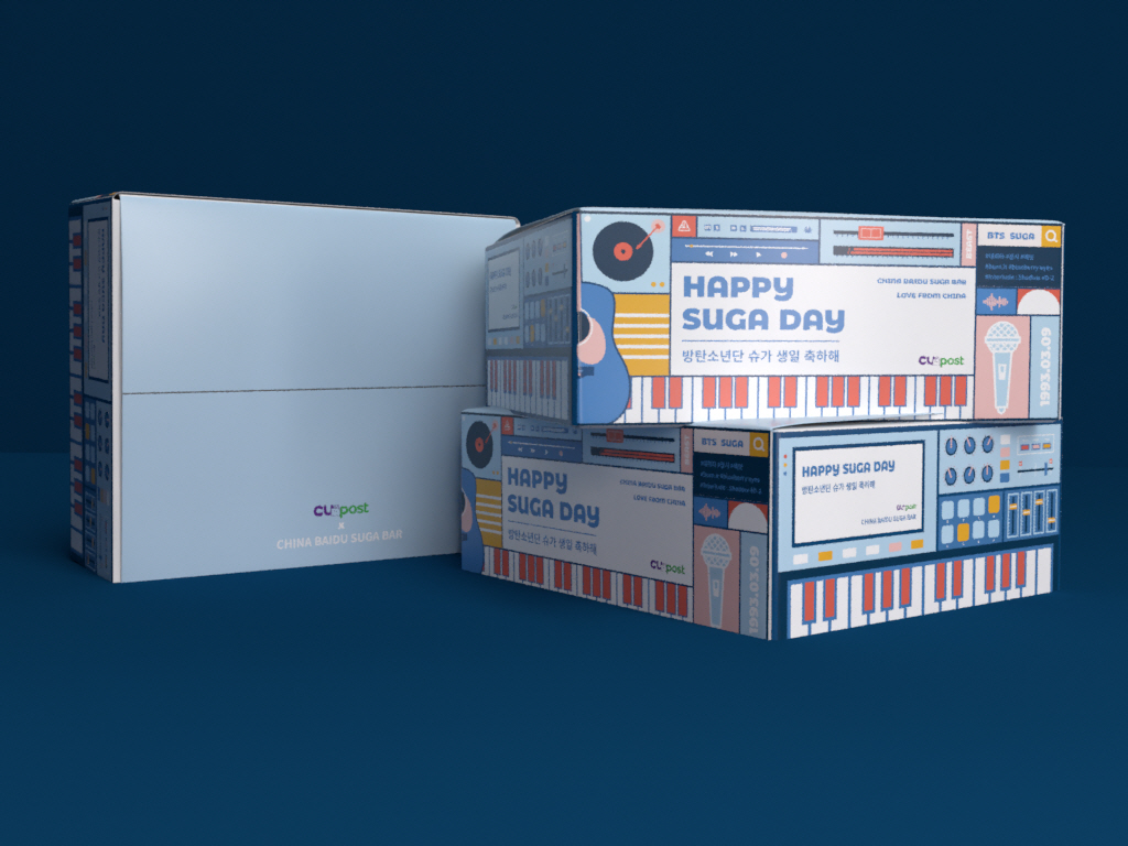 바이두 BTS SUGA Bar는 CU 택배 박스에 Happy suga day 콘센트로 직접 디자인한 광고를 진행한다고 밝혔다.