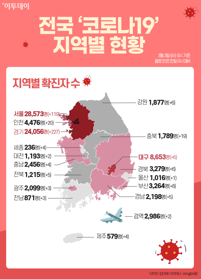 질병관리청 중앙방역대책본부에 따르면 3월 3일 0시 기준, 전일 0시 대비 444명이 추가 확진 판정을 받아 전국 확진자 수는 9만816명으로 늘었다.
