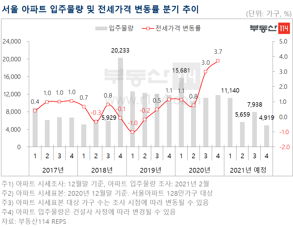 부동산 정보업체 부동산114에 따르면 올해 입주를 시작했거나 입주를 앞둔 서울 아파트는 2만9656가구다. 입주 아파트가 4만9078가구에 달했던 지난해보다 2만 가구 이상 적다. 그나마 1분기엔 1만1140가구가 입주하지만 2~4분기 입주 물량은 각각 4919가구~5659가구에 그친다. 윤지해 부동산114 수석연구원은 "2021년 2분기 이후 입주물량이 급감한다"며 "전셋값이 구조적으로 오른다"고 예상했다.