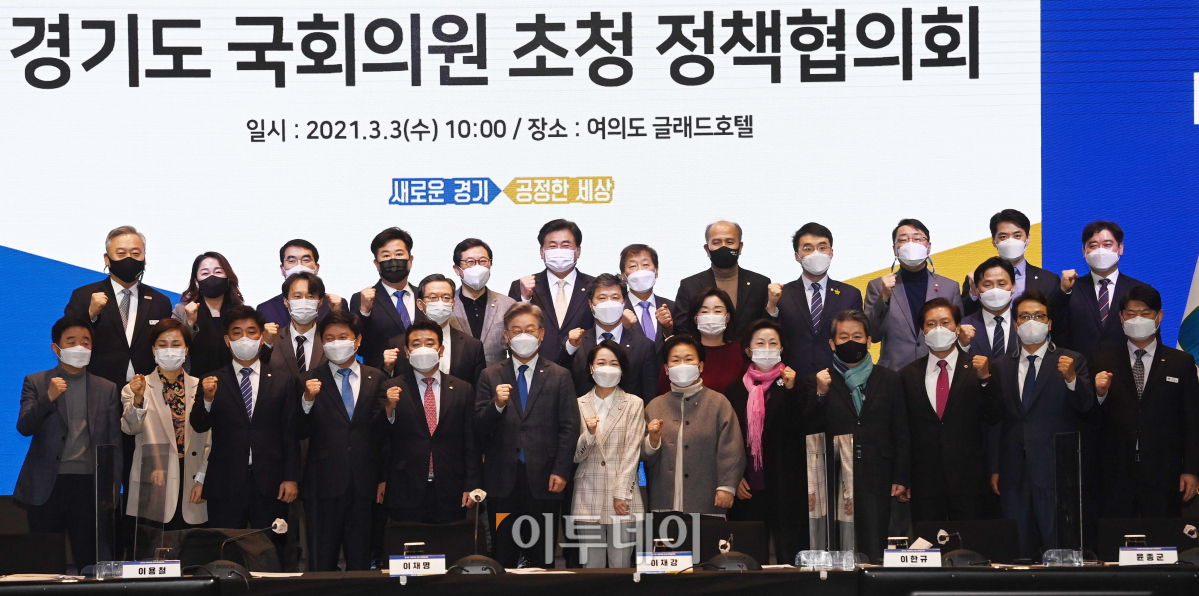 이재명(앞줄 왼쪽 여섯번째) 경기도지사가 3일 오전 서울 영등포구 콘래드호텔에서 열린 경기지역 국회의원 정책협의회에서 기념촬영을 하고 있다.