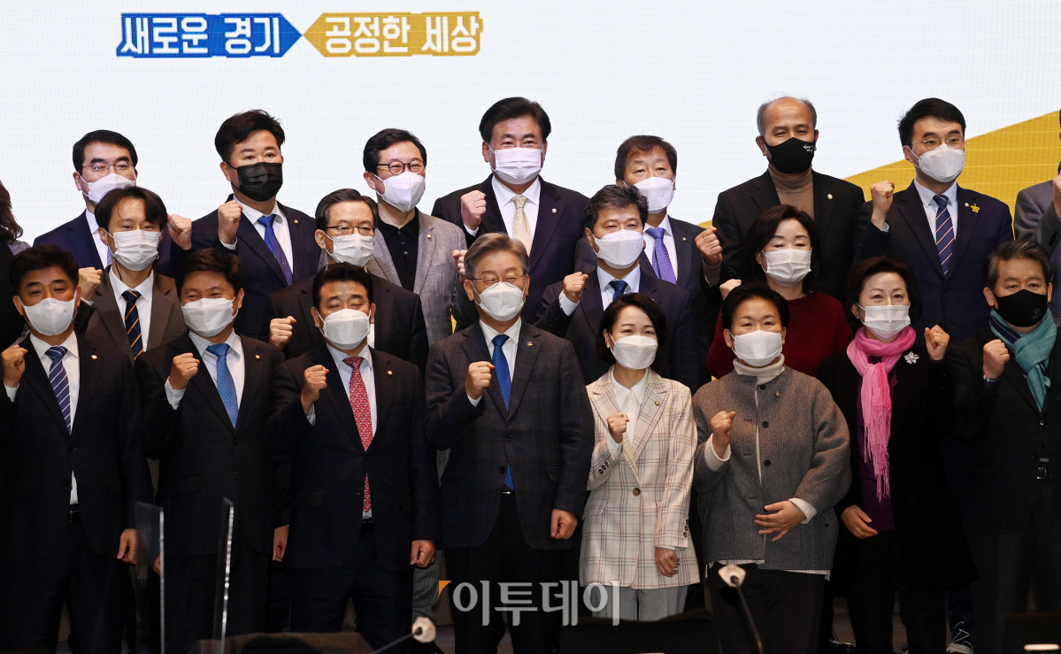 이재명(앞줄 왼쪽 네번째) 경기도지사가 3일 오전 서울 영등포구 콘래드호텔에서 열린 경기지역 국회의원 정책협의회에서 기념촬영을 하고 있다.