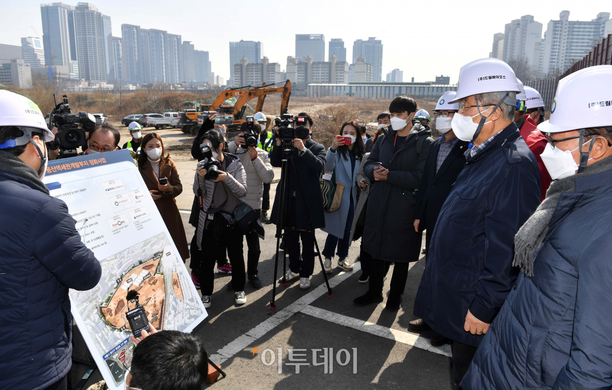 김종인 국민의힘 비상대책위원장이 3일 서울 용산 정비창 부지 정화사업 현장을 방문해 관계자로부터 사업내용을 듣고 있다. 국회사진취재단