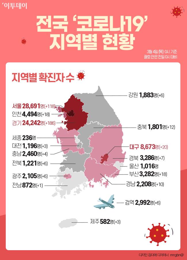 질병관리청 중앙방역대책본부에 따르면 3월 4일 0시 기준, 전일 0시 대비 424명이 추가 확진 판정을 받아 전국 확진자 수는 9만1240명으로 늘었다.
