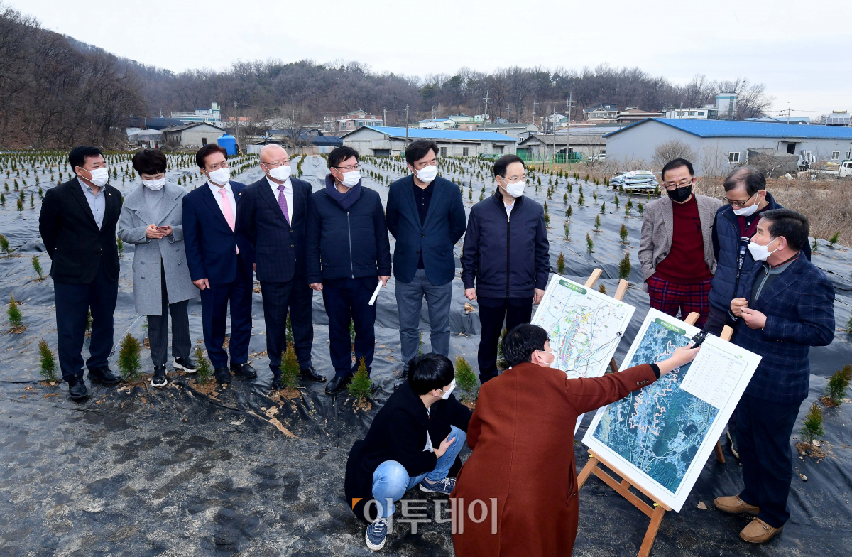 이헌승 국민의힘 국토교통위원회 간사와 국토위 위원들이 4일 광명·시흥 신도시가 들어설 부지를 LH 직원들이 조직적으로 사들였다는 의혹이 제기된 경기 시흥시 과림동 현장을 살펴보고 있다.