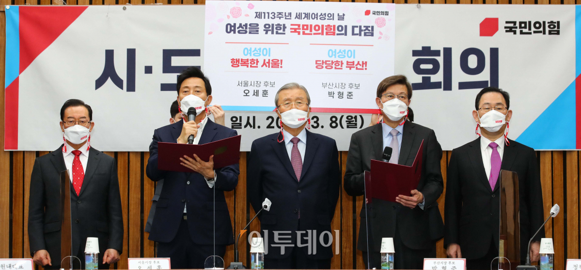 8일 오전 국회에서 열린 국민의힘 시-도당위원장 회의에서 오세훈 서울시장 후보(왼쪽 두번째)가 '세계여성의 날'을 맞아 여성을 위한 국민의힘의 다짐을 발표하고 있다.