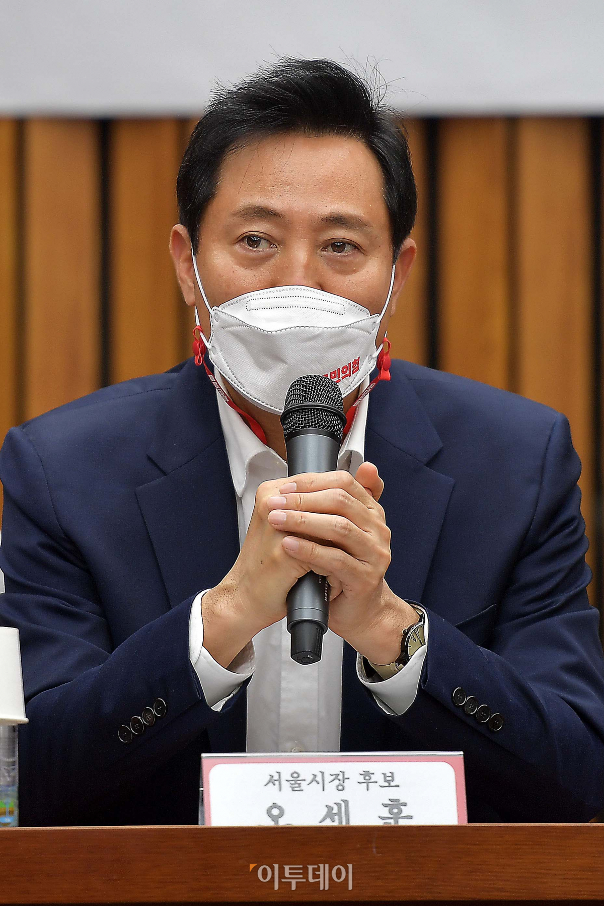 오세훈 국민의힘 서울시장 후보가 8일 서울 여의도 국회에서 열린 서울·부산시장 후보 및 시·도당위원장 연석회의에서 인사말을 하고 있다.