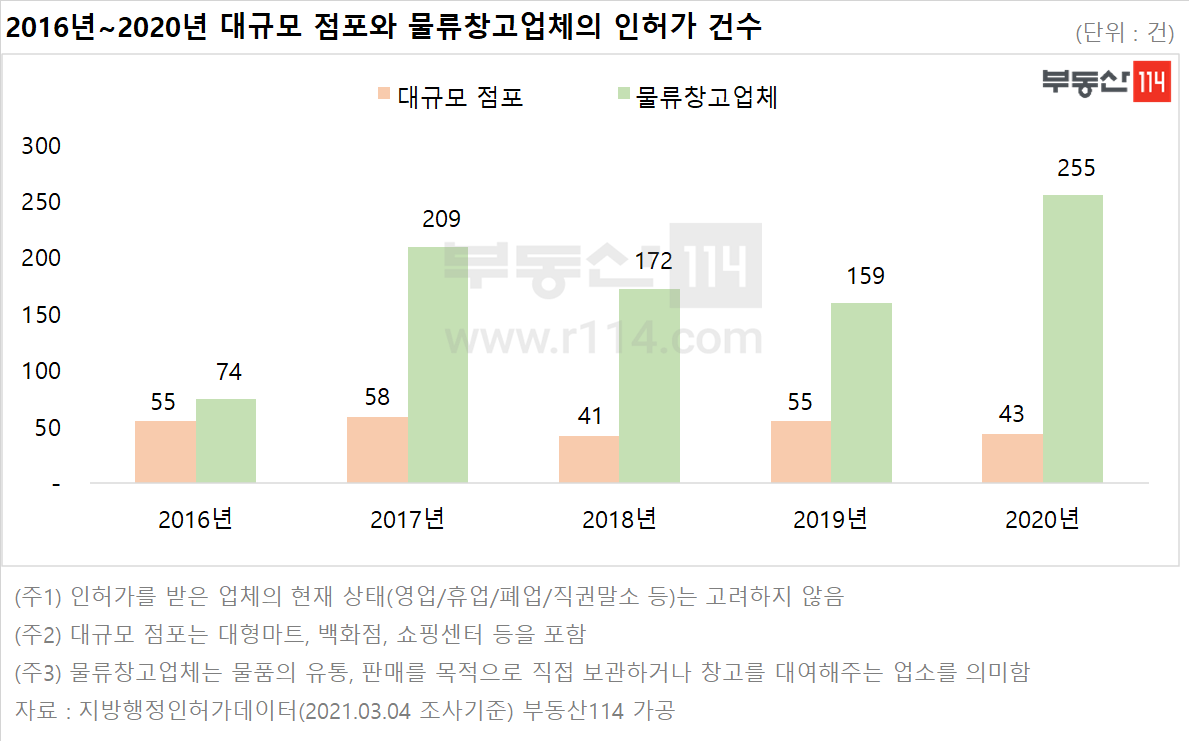 부동산 정보업체 부동산114에 따르면 2016년부터 지난해까지 설립 인허가를 받은 물류창고업체는 869곳이다. 같은 기간 신설 허가를 받는 대규모 점포(백화점ㆍ대형마트ㆍ쇼핑센터, 259곳)보다 세 배 넘게 많다. 지난해에만 물류창고업체 255곳이 새로 문을 열었다.