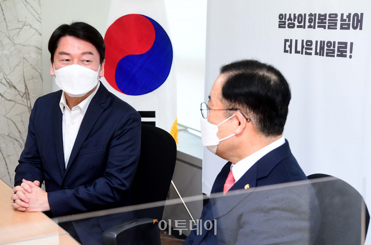 국민의당 대표인 안철수 서울시장 후보가 9일 서울 여의도 국민의힘서울시당을 찾아 서울시당위원장인 박성중 의원과 대화하고 있다.