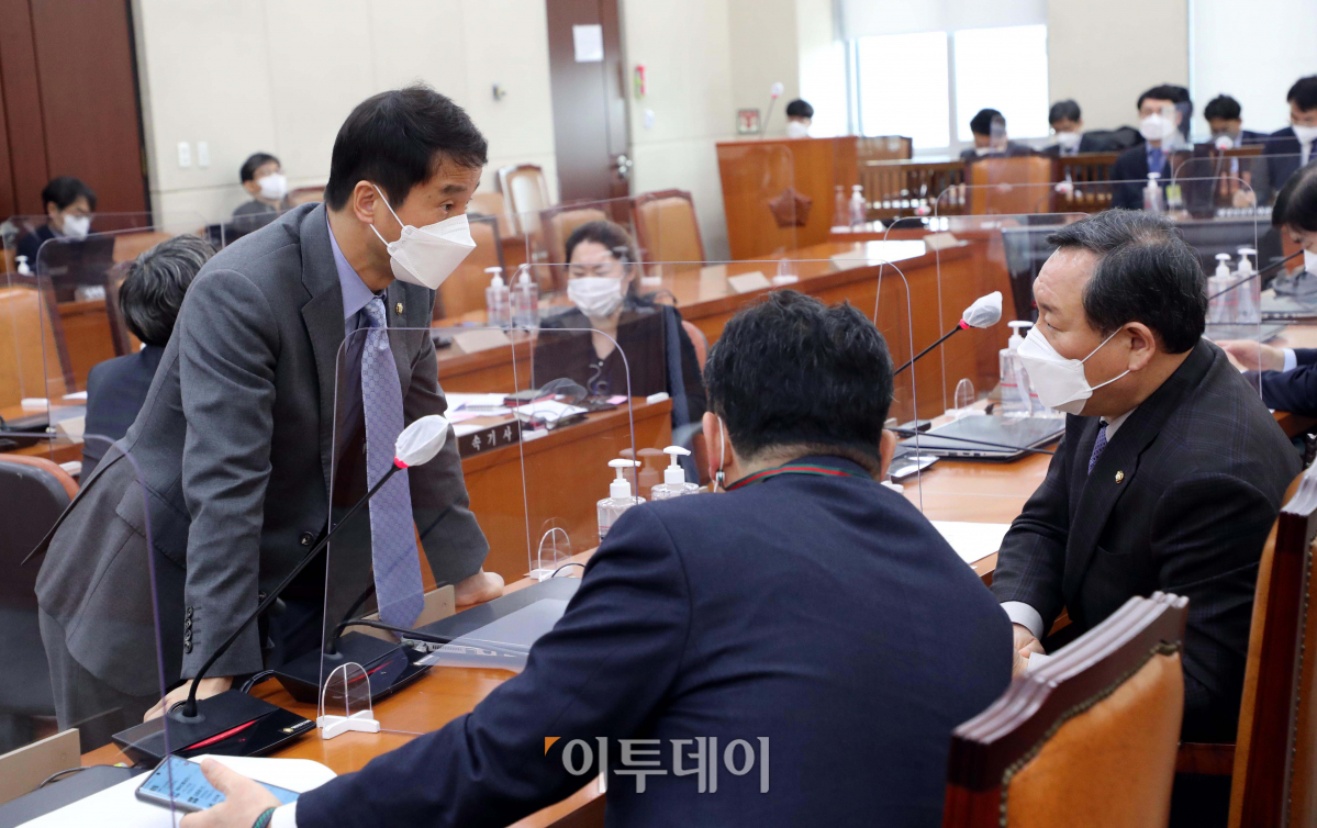 9일 오전 서울 국회에서 열린 행전안전위 소위에 국민의힘 의원들이 불참하자 한병도 소위위원장이 더불어민주당 의원들과 상의를 하고 있다.