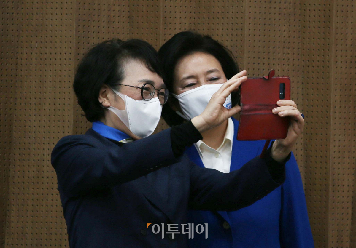 서울시장 후보인 더불어민주당 박영선 후보, 열린민주당 김진애 후보가 9일 오후 서울 여의도 국회 소통관에서 열린 단일화 방안 발표 기자회견에서 사진을 찍고 있다.