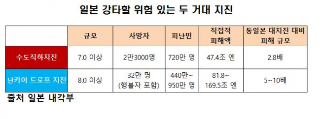 일본 토목학회가 분석한 ‘난카이 트로프 거대지진 또는 수도권 직하 지진 발생 시 장기 경제적 피해 추산’에 따르면 대지진 위험 지역으로 꼽히는 ‘난카이 트로프’에서 지진이 발생하면 직·간접적으로 향후 20년간 최대 1410조 엔(약 1경3700조 원) 규모에 이르는 경제적 피해가 발생할 수 있다. 직접적인 피해액도 동일본 대지진의 5~10배에 달해 일본이 최빈국으로 전락할 가능성이 있다는 경고까지 나온다.