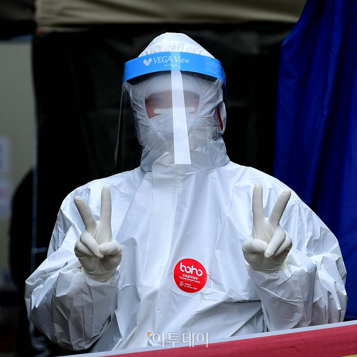 코로나19 신규 확진자가 3주째 300~400명대를 유지하고 있다. 보건의료인을 중심으로 백신 접종이 시작됐지만 최근 수도권을 중심으로 집단감염이 발생, 신규 확진자가 늘어나 긴장의 끈을 놓칠 수 없는 상황이다. 서울의 한 보건소 선별진료소에서 방호복을 입은 의료 관계자가 손가락으로 ‘브이’ 자를 그려 보이고 있다. 악전고투속 미소를 잃지 않는 모습이 미안하고 고마울 따름이다.