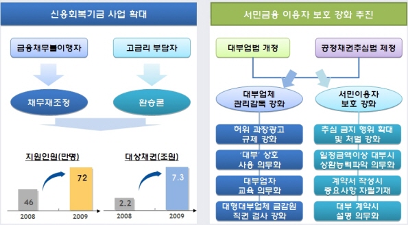 또한 서민금융 이용자 보호 강화를 위해 '대부업법'과‘공정채권추심법’의 조속한 제개정을 통해 대부업체의 관리와 감독을 강화하기로 했다.