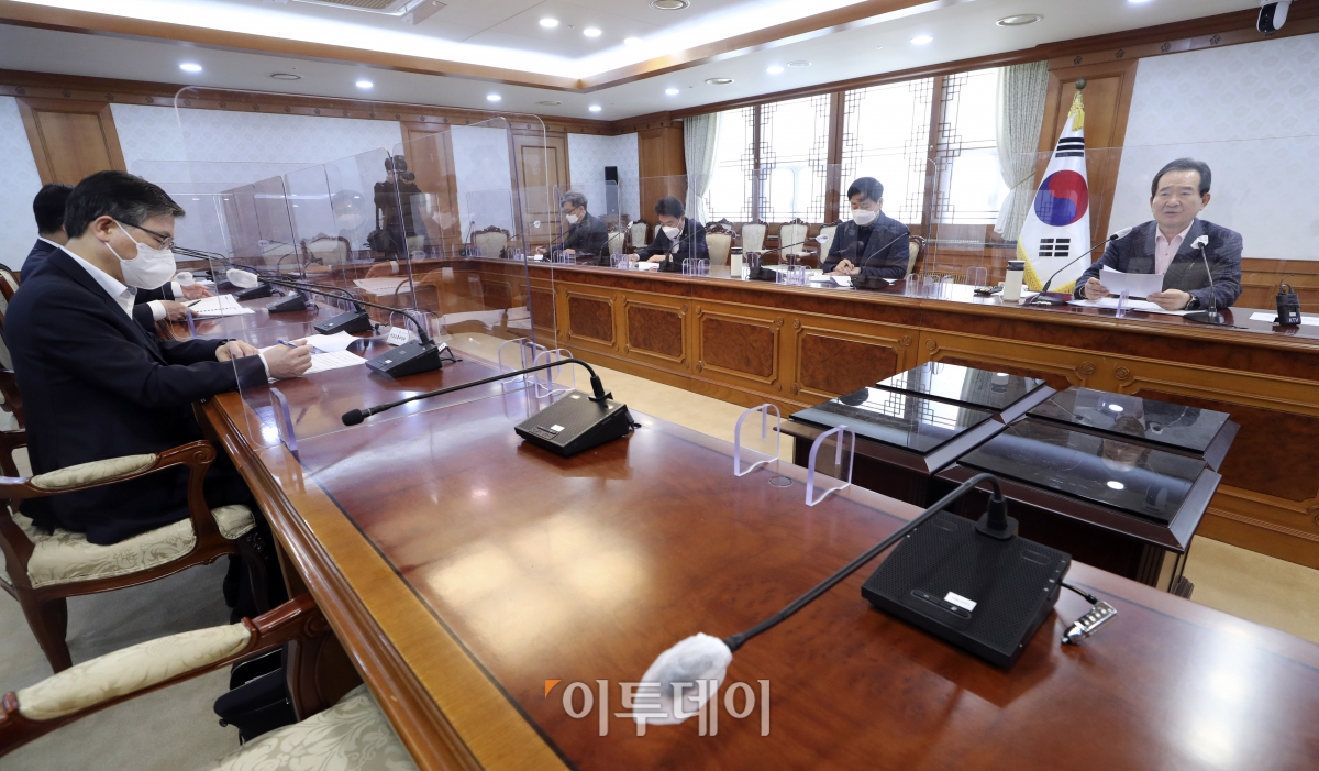 정세균(오른쪽) 국무총리가 14일 서울 세종대로 정부서울청사에서 열린 한국토지주택공사(LH) 후속조치 관계장관회의에 참석해 발언하고 있다. 왼쪽은 변창흠 국토교통부 장관.