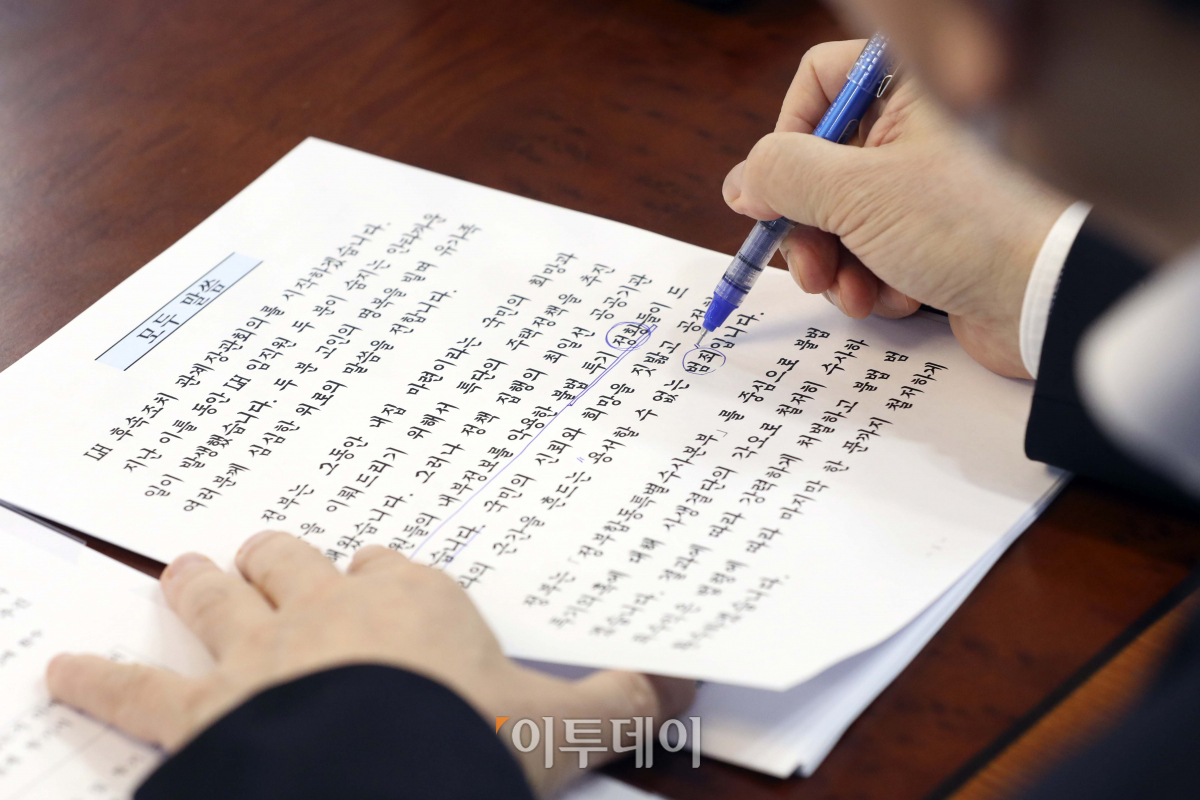 변창흠 국토교통부 장관이 14일 서울 세종대로 정부서울청사에서 열린 한국토지주택공사(LH) 후속조치 관계장관회의에 참석해 정세균 국무총리의 발언에 표시를 하고 있다.