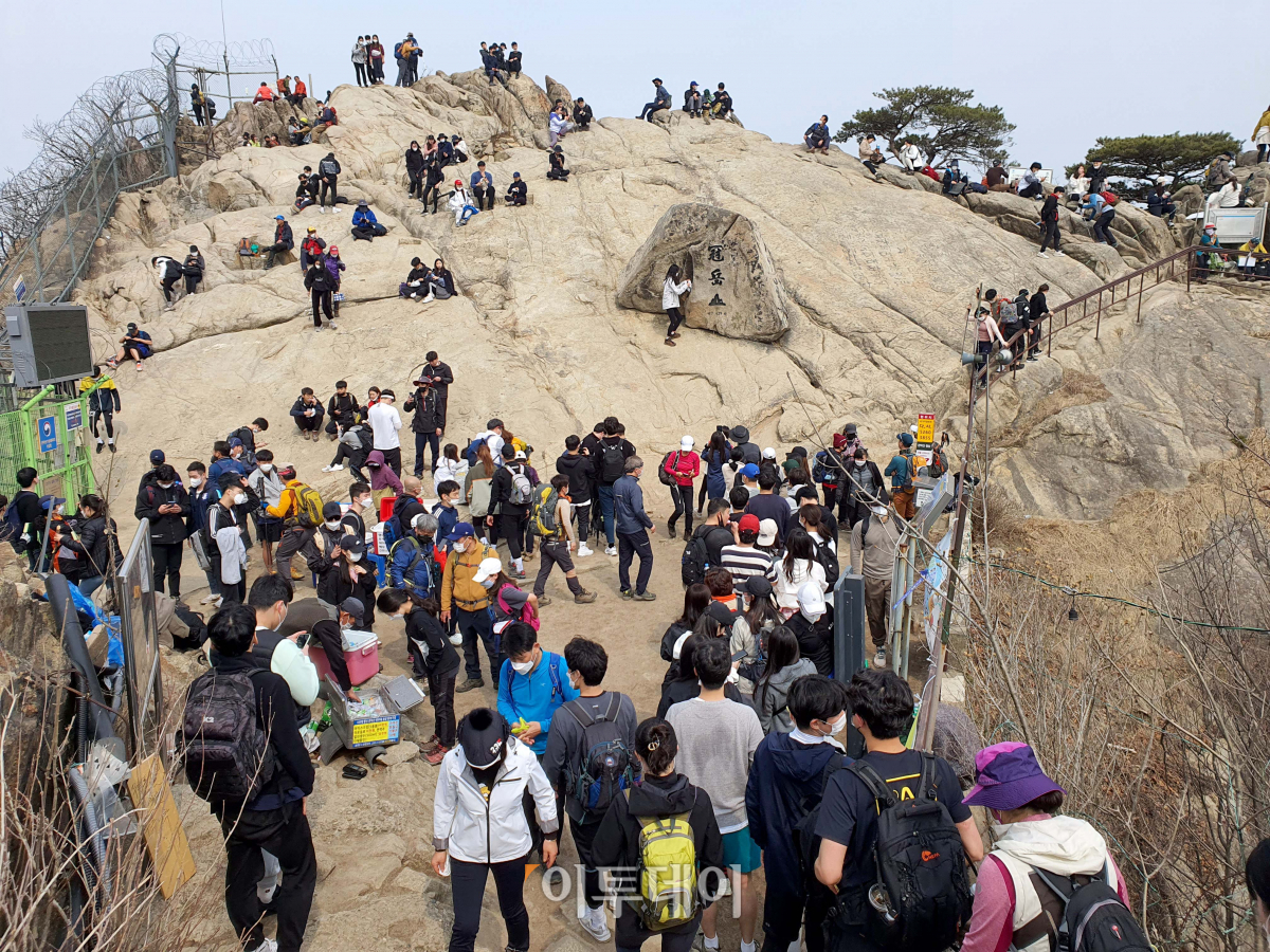 14일 오전 관악산 연주대가 등산을 나온 시민들로 붐비고 있다. 코로나19 신규 확진자가 연일 400명대를 기록하는 등 확산세가 지속되고 있다. 등산객이 몰리는 봄철 산행엔 마스크 쓰기와 거리두기 등 방역수칙 준수에 대한 경각심이 필요하다.