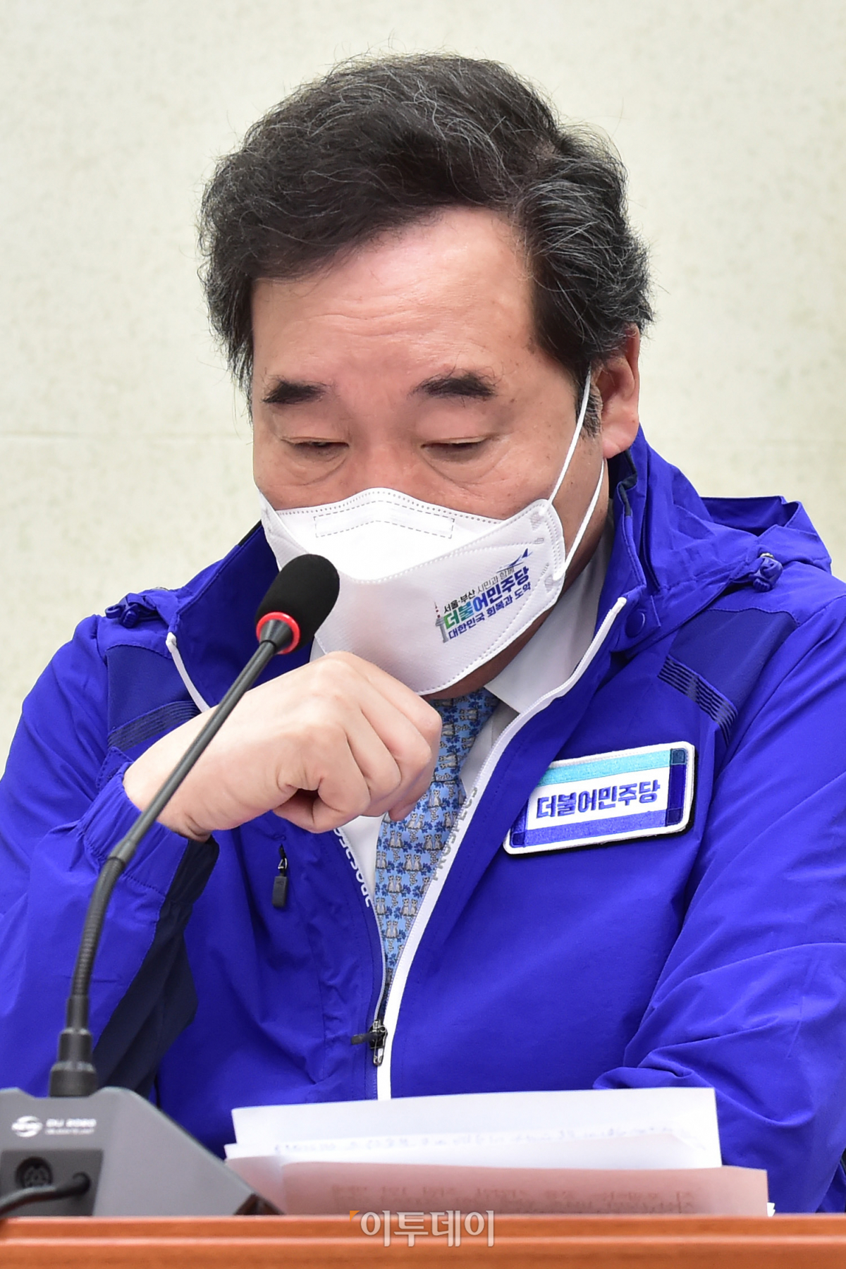 이낙연 상임선대위원장가 15일 서울 여의도 국회 본관 206호에서 열린 더불어민주당 중앙선대위 회의에 참석, 생각에 잠긴듯한 표정을 보이고 있다.