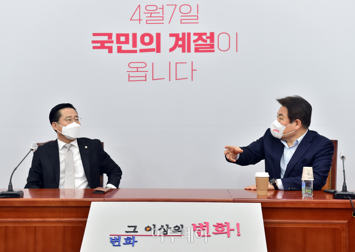 정양석 국민의힘 사무총장과 이태규 국민의당 사무총장이 15일 국회에서 열린 오세훈·안철수 서울시장 후보 단일화 실무협상 4차 회의에서 대화를 나누고 있다.