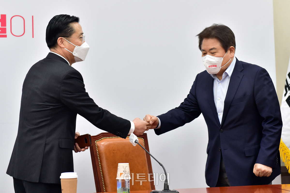 정양석 국민의힘 사무총장과 이태규 국민의당 사무총장이 15일 국회에서 열린 오세훈·안철수 서울시장 후보 단일화 실무협상 4차 회의에서 인사를 나누고 있다.