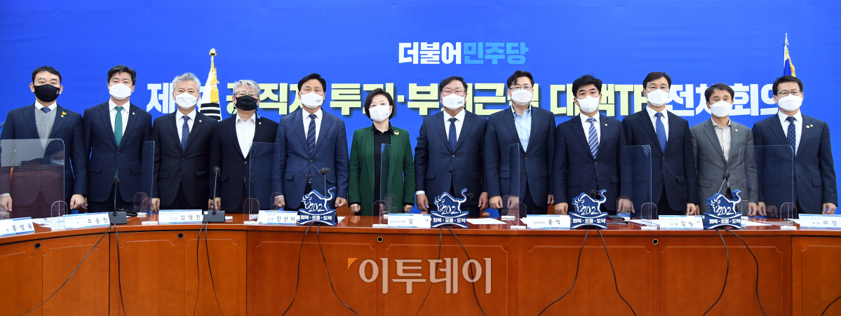 15일 서울 여의도 국회에서 더불어민주당 제 1차 공직자 투기-부패근절 대책 TF 전체회의가 열린 가운데 김태년 직무대행과 진선미 팀장을 비롯한 위원들이 기념촬영을 하고 있다. 왼쪽부터 김용민 의원, 박상혁 의원, 홍성국 의원, 조응천 의원, 김영진 의원, 진선미 팀장, 김태년 직무대행, 홍익표 정책위의장, 김병욱 의원, 위성곤 의원, 한병도 의원, 임호선 의원.