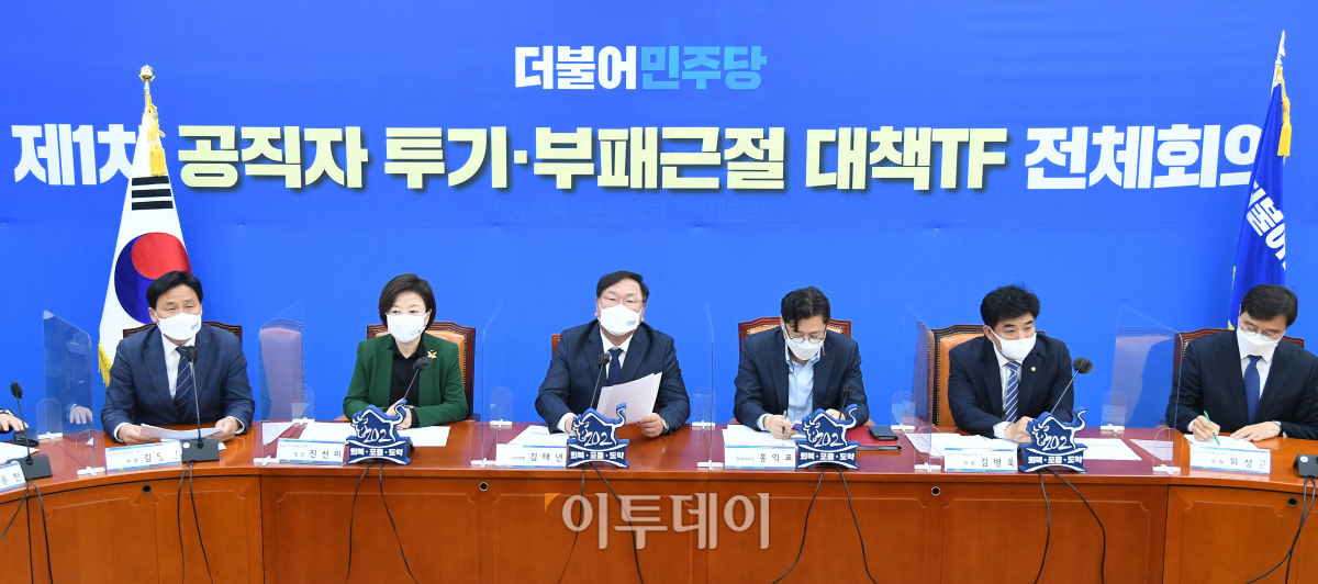 김태년 더불어민주당 대표 직무대행(왼쪽 세번째)이 15일 서울 여의도 국회에서 열린 제 1차 공직자 투기-부패근절 대책 TF 전체회의에 참석해 모두 발언하고 있다.