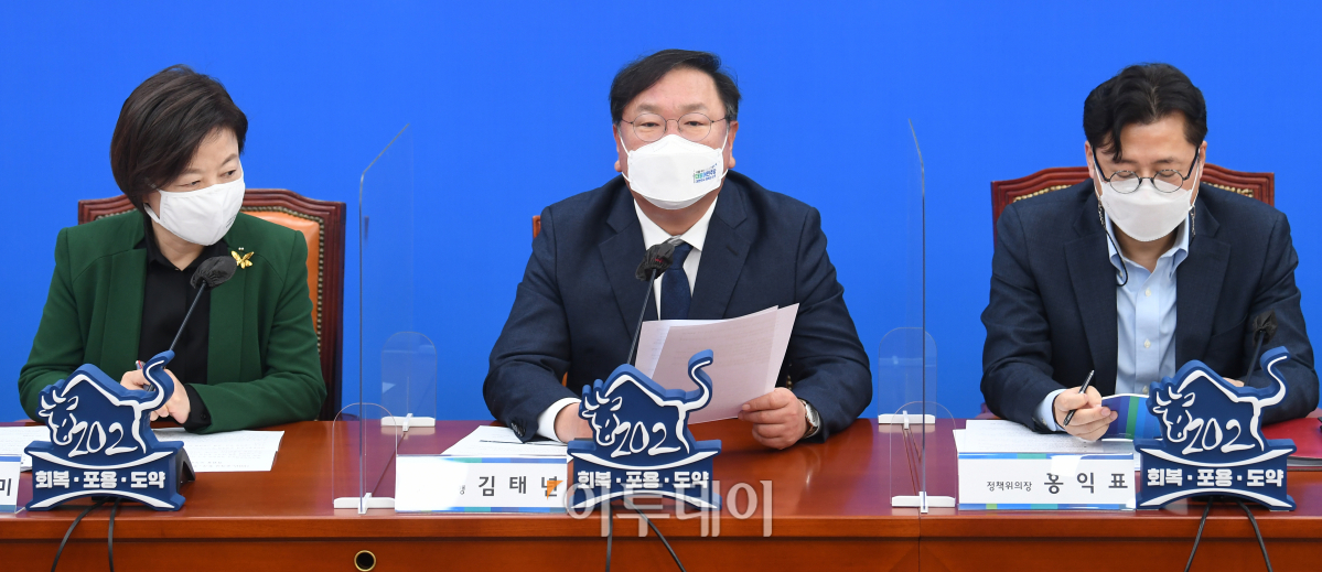 김태년 더불어민주당 대표 직무대행(가운데)이 15일 서울 여의도 국회에서 열린 제 1차 공직자 투기-부패근절 대책 TF 전체회의에 참석해 모두 발언하고 있다. 왼쪽 진선미 TF팀장과 오른쪽은 홍익표 정책위의장.