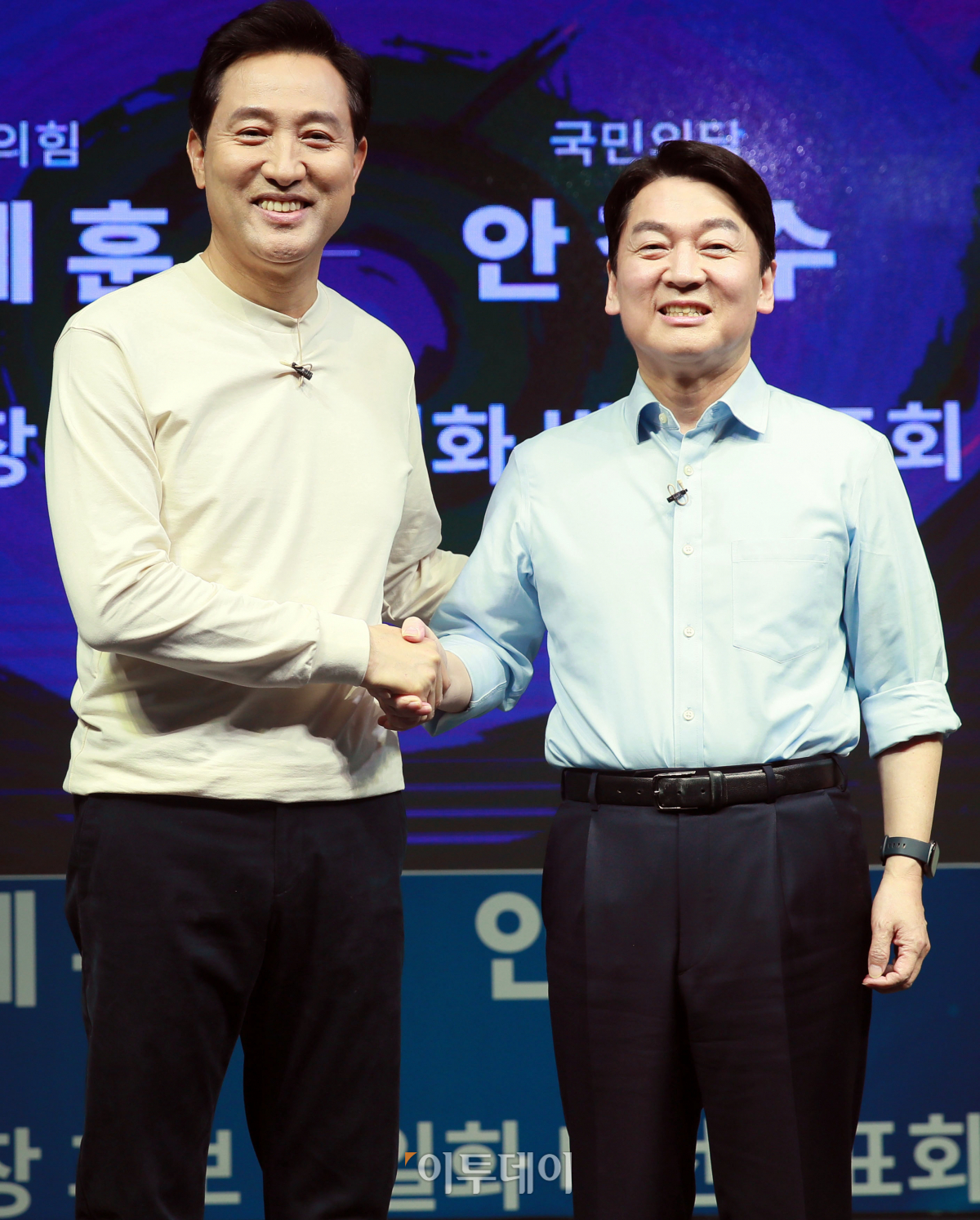 오세훈 국민의힘 서울시장 후보와 안철수 국민의당 서울시장 후보가 15일 오후 서울 영등포 더플러스 스튜디오에서 열린 단일화 비전발표회에 앞서 포토타임을 갖고 있다. 국회사진취재단