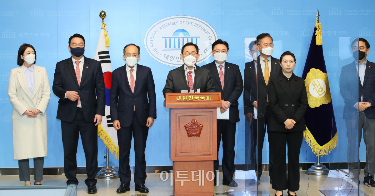 국민의힘 주호영 원내대표와 원내대표단이 16일 국회 소통관에서 LH 부동산 투기 사태와 관련해 특검 및 국정조사, 국회의원과 청와대 등 전수조사를 요구하고 있다.