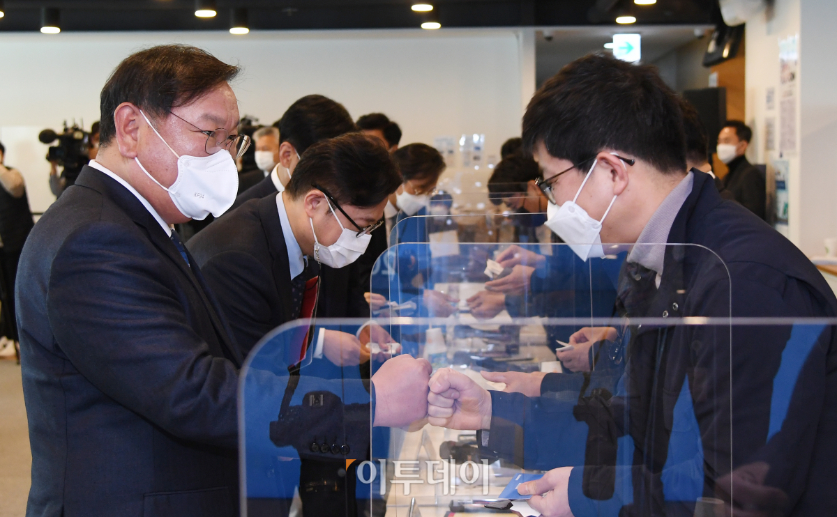 김태년 더불어민주당 대표 직무대행이 16일 서울 용산구 서울창조경제혁신센터에서 열린 규제혁신추진단 현장정책간담회에 참석해 벤처기업 관련 관계자들과 인사를 나누고 있다. 국회사진취재단