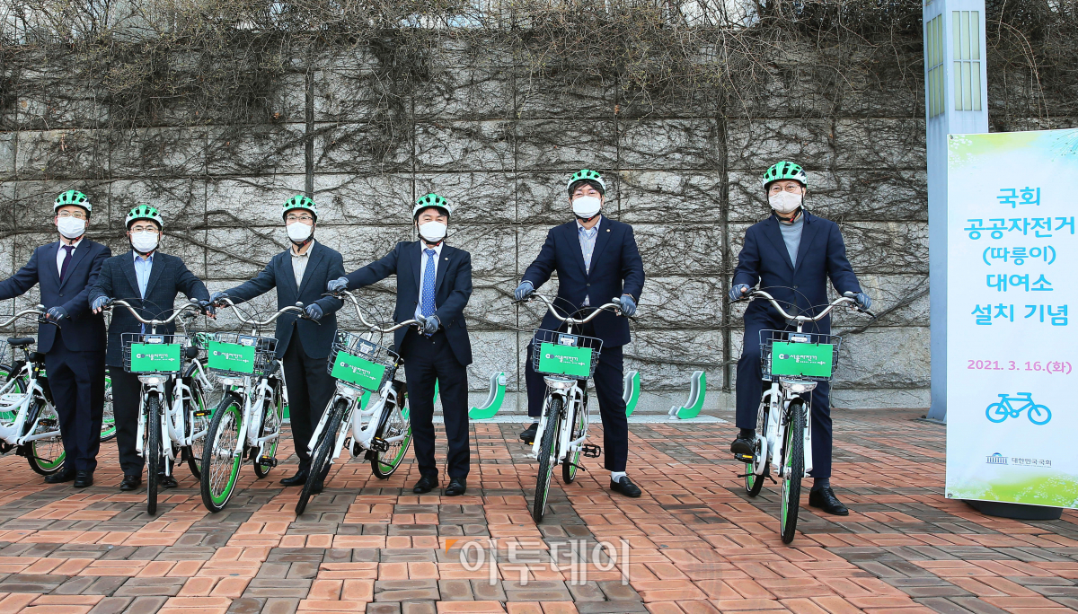 이춘석 국회사무총장과 김성주 더불어민주당 의원을 비롯한 참석자들이 16일 오전 서울 여의도 국회에서 국회 공공자전거(따릉이) 대여소 설치 및 시승식에 참석해 기념촬영을 하고 있다.