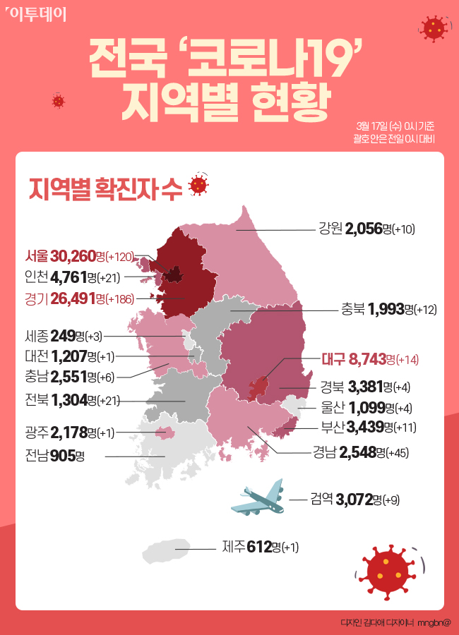 질병관리청 중앙방역대책본부에 따르면 3월 17일 0시 기준, 전일 0시 대비 469명이 추가 확진 판정을 받아 전국 확진자 수는 9만6849명으로 늘었다.