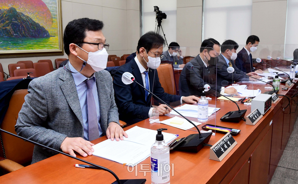 17일 서울 여의도 국회에서 열린 정무위원회 전체회의에서 이해충돌방지법에 대한 공청회가 진행되고 있다. 사진 왼쪽부터 윤태범 한국방송통신대 교수, 이재근 참여연대 권력감시국장, 이천현 한국형사정책연구원 선임연구위원, 임영호 법무법인 율정 변호사, 이건리 국민권익위원회 부위원장.