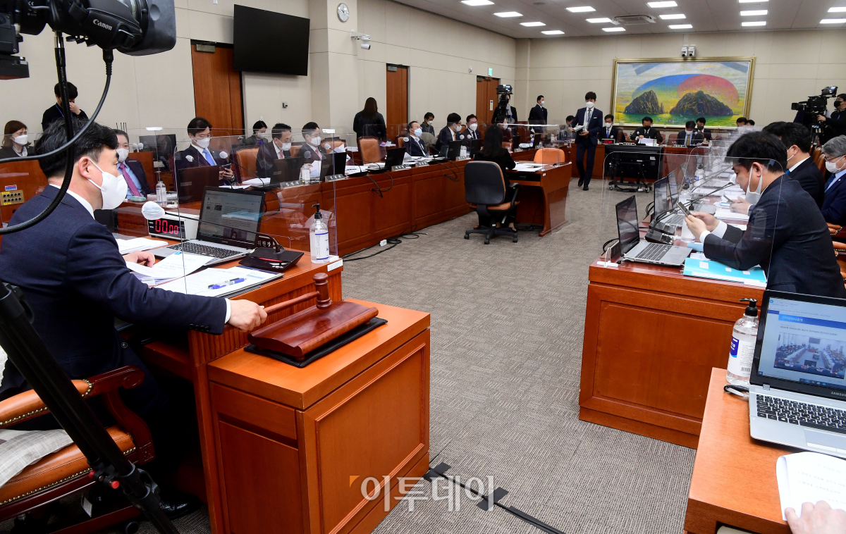 17일 서울 여의도 국회에서 열린 정무위원회 전체회의에서 윤관석 위원장이 이해충돌방지법에 대한 공청회 개의를 알리고 있다.