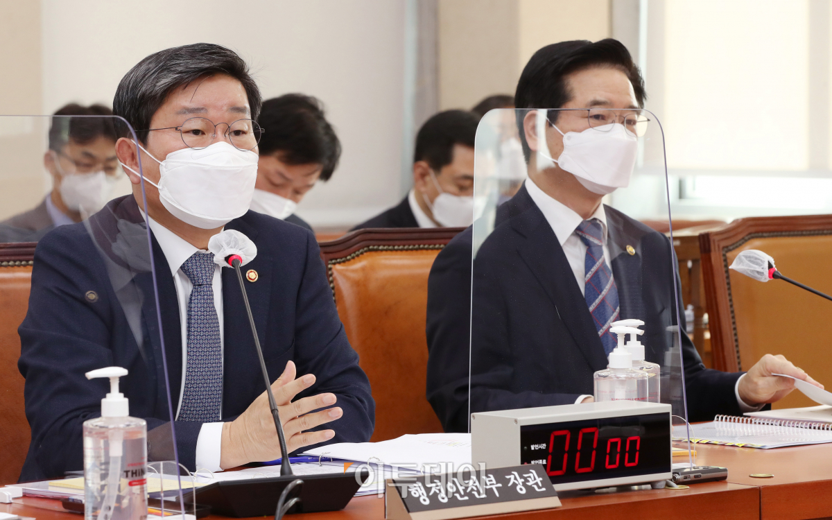 전해철 행정안전부 장관이 17일 국회에서 열린 행정안전위원회 전체회의에 출석, 질의에 답변하고 있다. 오른쪽은 김창룡 경찰청장.