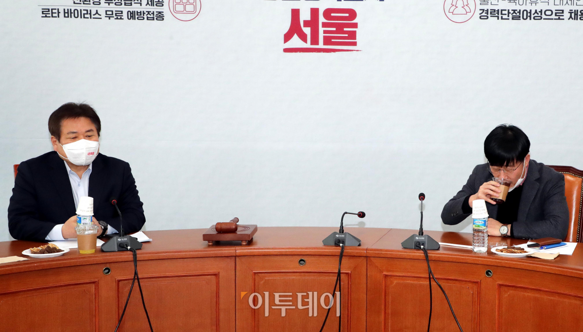 정양석 국민의힘 사무총장과 이태규 국민의당 사무총장이 17일 오후 국회에서 열린 오세훈·안철수 서울시장 후보 단일화 실무협상 회의에 굳은 표정으로 참석하고 있다.
