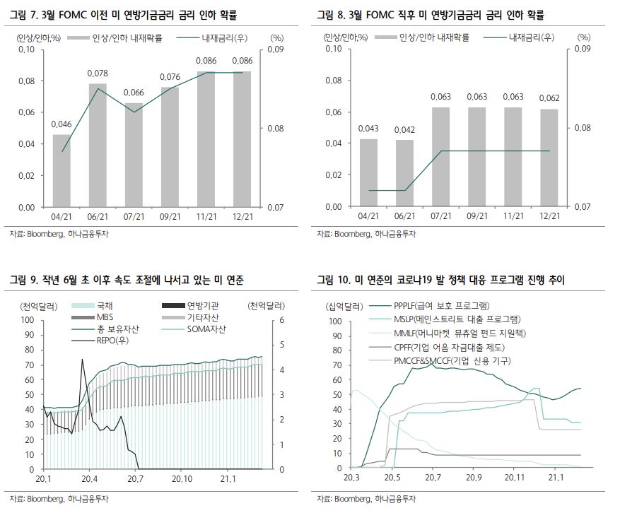 나중혁 하나금융투자 연구원은 “3월 성명서에서는 팬데믹에 가장 많이 영향을 받은 부문은 여전히 약하지만, ‘경제 활동과 고용 지표들이 최근 들어 반등하기 시작했다’는 문구가 눈에 띈다”라면서 “지난 1월에는 ‘경제활동과 고용 회복 속도가 최근 몇 달간 완만했다’는 표현을 감안할 때 경기 회복에 대한 상당한 자신감이 느껴진다”고 말했다.