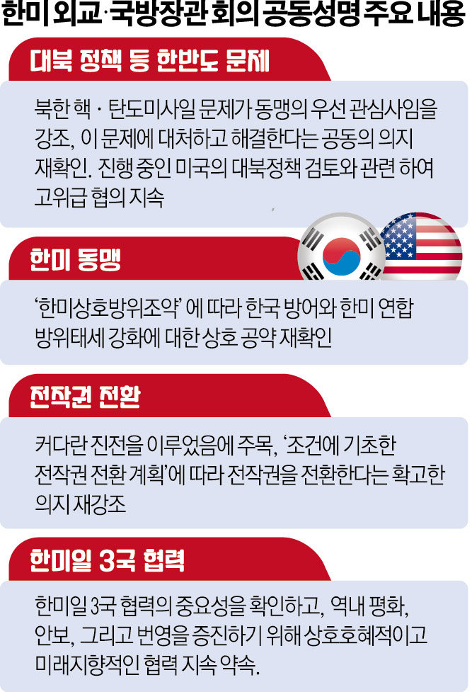 다만 한·미 외교ㆍ국방 장관회의 공동성명에서 ‘북한 비핵화’라는 표현이 빠진 것은 희망적이라는 평가다. 공동성명에는 “북한 핵·탄도미사일 문제가 동맹의 우선 관심사임을 강조하고, 이 문제에 대처하고 해결한다는 공동의 의지를 재확인했다”는 정도가 언급됐다. 북핵과 관련한 내용이 빠진 것은 북한을 대화의 장으로 이끌어내려면 불필요한 자극을 피해야 한다는 우리 정부의 뜻이 반영된 결과로 보인다.